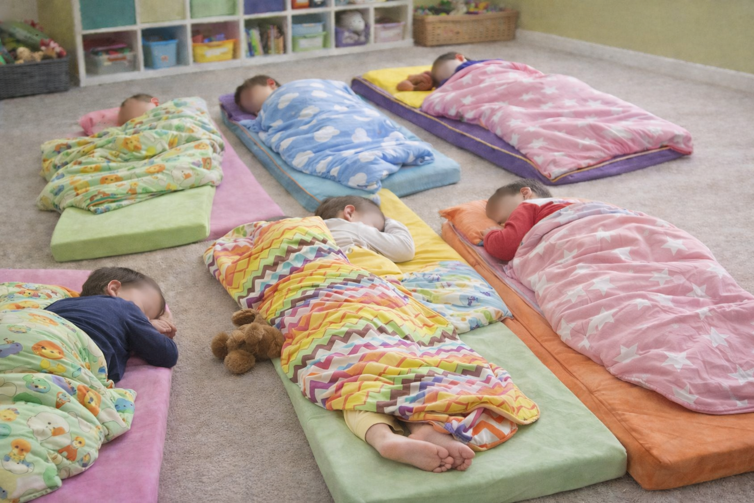Učitelky místo odpočinku tráví čas neustálým přikrýváním dětí.