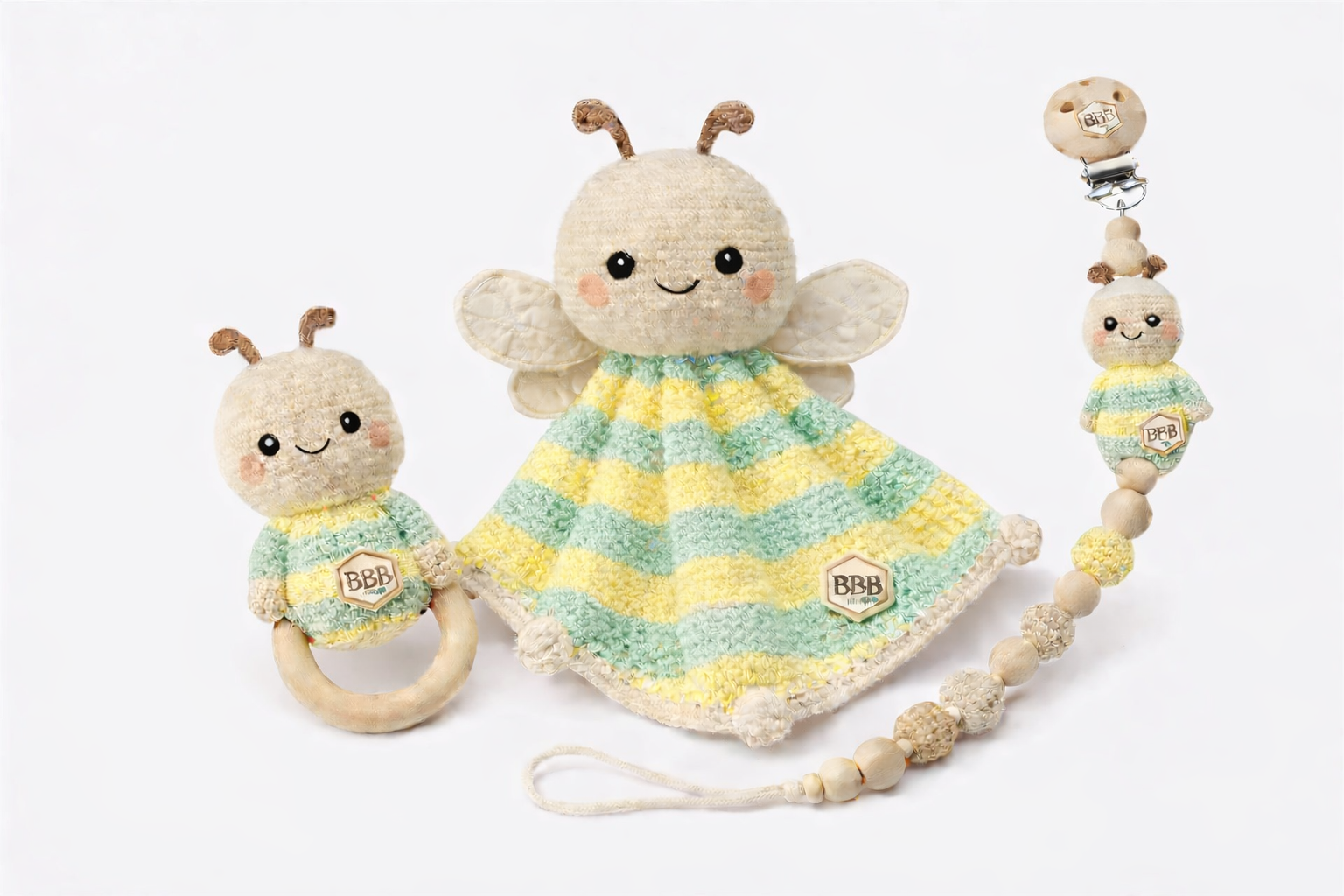 Ručně háčkovaná sada pro nejmenší obsahuje chrastítko, usínáčka a klip na dudlík.