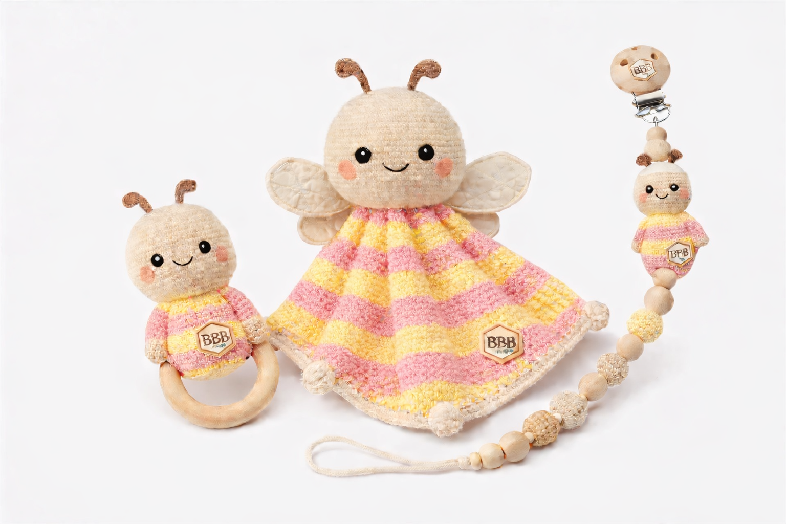 Ručně háčkovaná sada pro nejmenší obsahuje chrastítko, usínáčka a klip na dudlík.